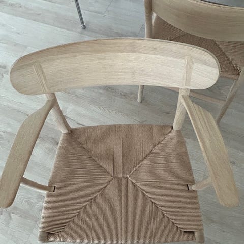 Hans J Wegner spisebordsstol udført i træ med polstret sæde. Stolen har armlæn og en enkel, funktionel konstruktion. Designet til brug ved spisebordet eller som ekstra siddeplads i hjemmet. Der er 10 stk pris for alle