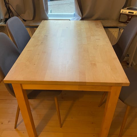 Bordet er 70 cm bredt, men har to små klapper, en på hver side, som hver er 22 cm bred. Ved den ene side er der en lille skuffe under pladen. Det trænger til en omgang, men er ikke i stykker.