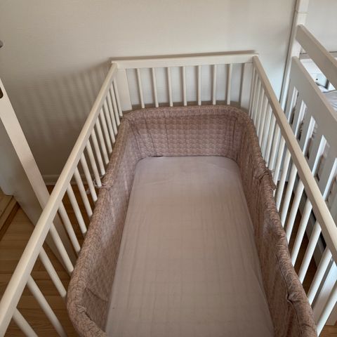 Tremmeseng m. skuffer i fin stand, med medfølgende fast sengerand og sengelomme fra Konges Sløjd, madras, 2x lagen og vådliggerlagen.