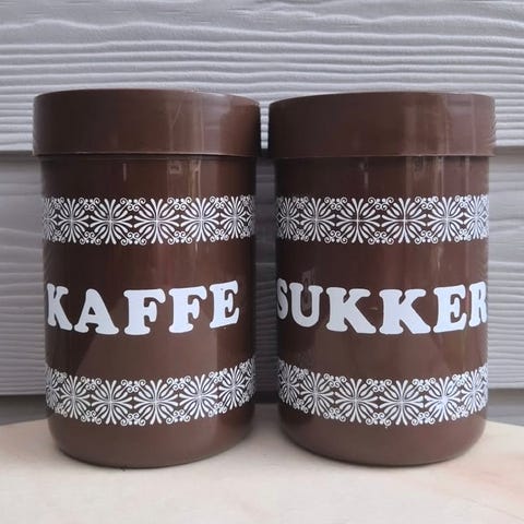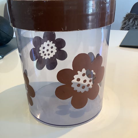 Erik Kold dåse med gennemsigtig krop og røde blomsterprint. Beholderen har en rød låg og kan anvendes til opbevaring af forskellige småting eller fødevarer.