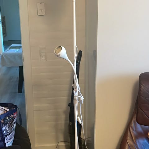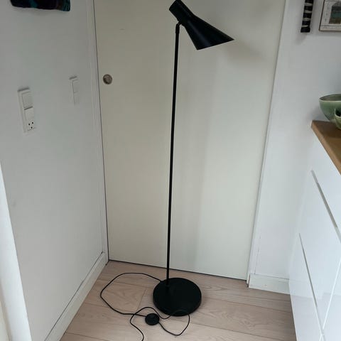 Louis Poulsen stander lampe i hvid farve. Lampen har en rund skærm, sælges til renovering