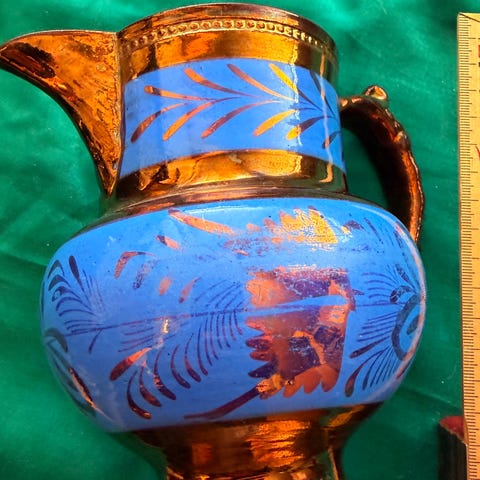 BOAC keramisk kande i blå farve med håndtag og tud. Kanden har et dekorativt emblem på siden og er velegnet til servering af drikkevarer. H: 14 cm. I superfin stand.