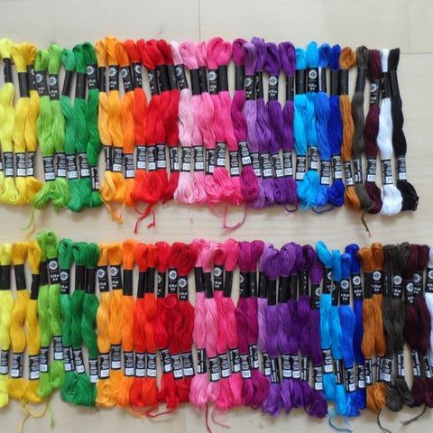 Broderigarn, mouline bomuldsbroderigarn med 6 tråde. Forskellige fabrikater: Dmc, Anchor, Bela, Cewec m. fl. alle kan bruges i samme arbejde, da de har samme tykkelse.