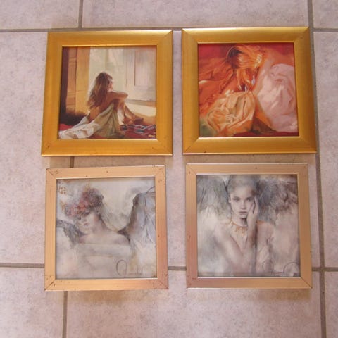 2 fine billeder med farve design med træramme som er malet i ”guld/sølv” patina stil. De måler 24,5 cm i både højde og bredde og 3 cm tykke. Billederne er stadig med emballage - pap i hjørnerne. Nye og ubrugte. Se div. foto. Et stk Kr. 75 og begge to kr. 100. KAN OGSÅ SENDES.