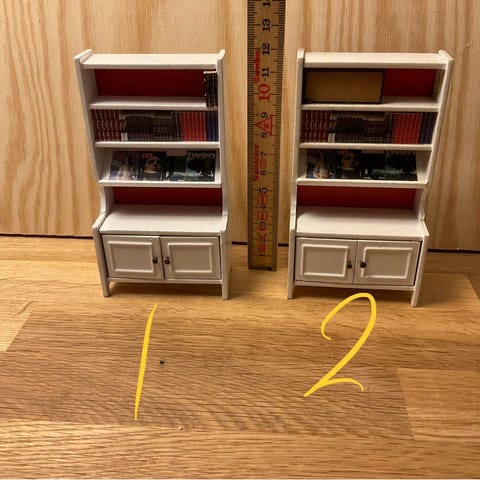 Dukkehus-møbler, DEN MED SKUFFER ER SOLGT. ...., 2 originale Lundby hvide reoler hvor skabe og skuffer kan åbnes sælges pris 50 kr PR STK jeg sender køber betaler Porto