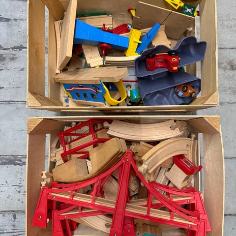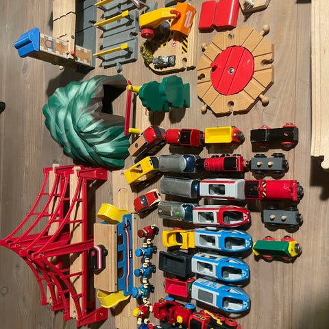 BRIO trætogbane sæt med forskellige træskinner, tog, biler, huse, træer, bænke og tilbehør. Indeholder spor, broer, en parkeringsgarage og flere små dele i forskellige farver. Velegnet til børn til leg og udvikling af finmotorik. Indeholder også et grønt tog med lys til batteri samt 2 lyntog med 1 vogn og mennesker.