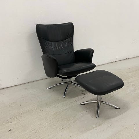 Freja lænestol m/skammel i sort læder og med dreje og vippefunktion.