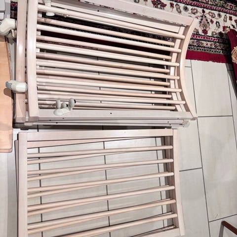 Stokke Tremmeseng i træ. Medfølger en sparsomt brugt madras købt til den yngste, men hun foretrak at sove mellem os.