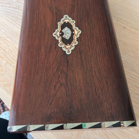 Antik æske i messing med ottekantet form. Æsken har låg med udskæringer og et håndtag på toppen. Æsken er dekoreret med mønstre og har en låsemekanisme på siden. Materialet er messing, og designet har et vintage udseende. H. 7 cm. B. 13 cm
