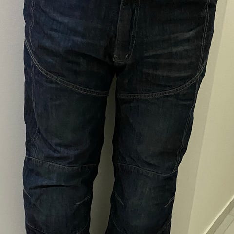Course MC-Jeans herre i blå denim. Størrelse EUR 34/32. Fremstillet i slidstærkt materiale. De originale sikkerheds-/stødpuder medfølger.