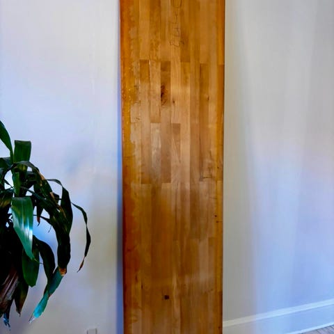 Massiv eg fuldstav 56 x 312 x 1223 mm. Er lakeret, bør nok slibes ned og olieres. Oprindelig tiltænkt som bar-bordplade. Vægt: ca 17kg.