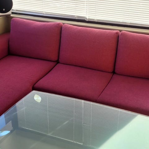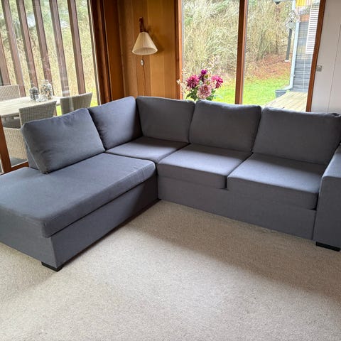 Hjørnesofa i gråt (en nuance af blåt) stof med rummelig siddeplads.