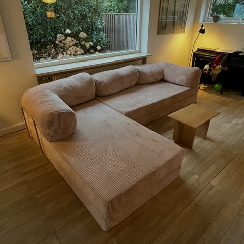 Brugt meget lidt og ingen synlige brugsspor. kan foldes ud til sovesofa og generelt meget praktisk.