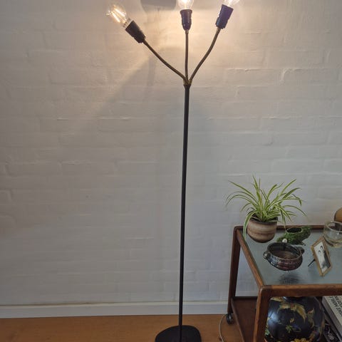 Retro standerlampe med tre arme.. ( trafiklyslampe) måler ca 153cm høj. lampeskærme medfølger dog kunne de godt trænge til at blive skiftes ud. Pris 1100kr.
