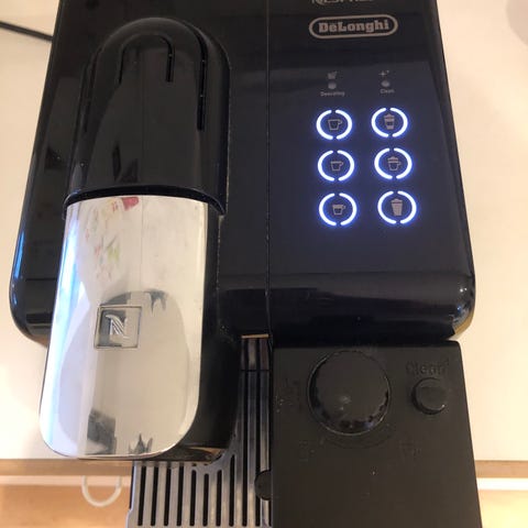 Nespresso kaffemaskine med tilhørende mælkeskummer. Kaffemaskinen har en kompakt størrelse og et enkelt design, der passer til brug i hjemmet eller på kontoret. Mælkeskummeren er udstyret med låg og kan anvendes til tilberedning af mælkeskum til forskellige kaffedrikke.