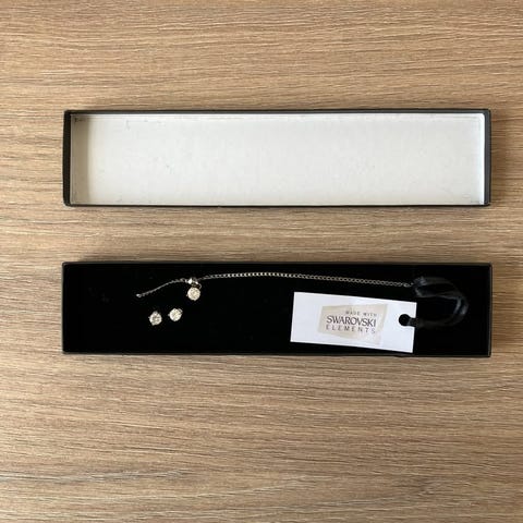 Swarovski smykkesæt bestående af halskæde med hjerteformet vedhæng og øreringe i swarovski krystal. Vedhænget er i silkehalskæde. Et flot og meget anvendeligt sæt.