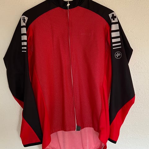 Assos cykeltrøje i rød/sort størrelse XL. Designet med fuld lynlås foran og tre lommer bagpå. Kun brugt få gange.