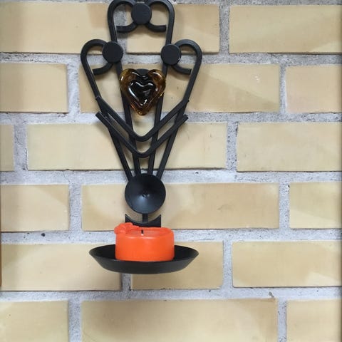 1970’ernes væglysestage, Dantoft kunst, smedejern med firkantet orange glasklump