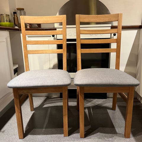 To upcyclede spisebordsstole i olieret egetræ med sæde i blåt stof. Samlet pris