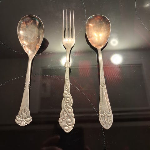 Et sæt serveringsbestik med skaft udskåret i ben og horn.