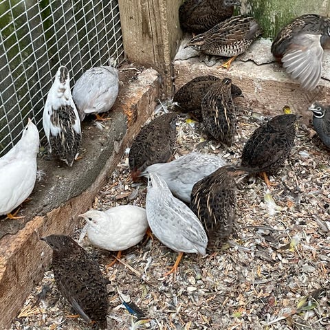 Årets allersidste bronze kalkunkylling, køn ukendt, større end på billedet og årets allersidste mørkebrune vagtel, hun, søger ny familie.