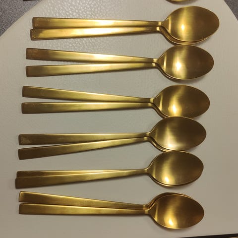 Fint bestik, som er brugt men uden fejl. Der er fire af hver og der medfølger små skeer.