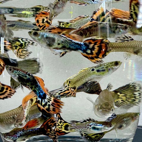 Hjemmeopdrættede små baby guppyer. De er 10-15 dage gamle. Blandede små størrelser.