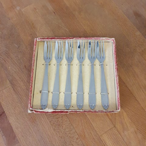 Otte helt nye og ubrugte kagegafler i æsker.