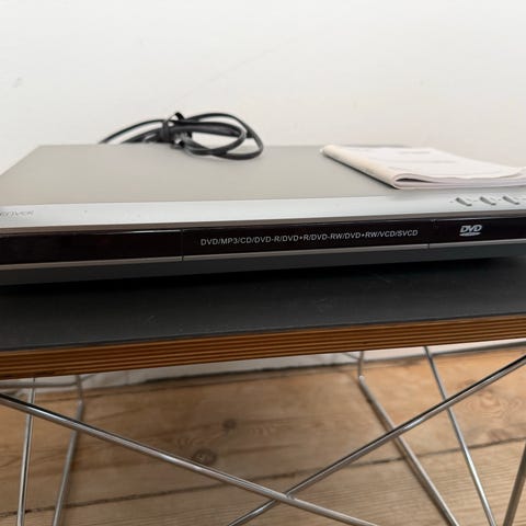 Sony DVD afspiller med tilhørende fjernbetjening. Enheden har en rund form og er designet til afspilning af DVD'er. Produktet er i brugt stand og leveres med kabler til tilslutning.