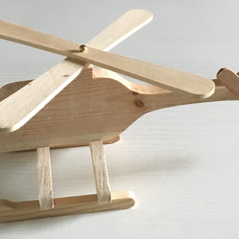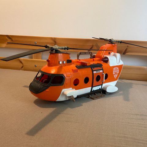 Rød helikopter som kan sige udrykningslyd og blinke. Rotorer kan kører rundt. Redningskurv kan hejses op og ned via knap.