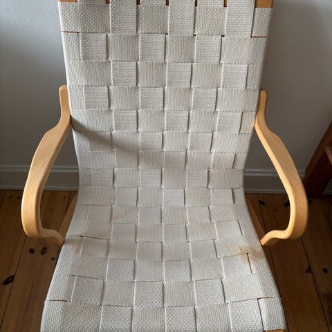 Jeg har 2 stk. Minder lidt om Bruno Mathsson stole, men jeg mener at det er det svenske mærke Lindlöfs Interiör. Stel af formstøbt bøgetræ, løse hynder af vaskbart uldstof. Fremstår med brugsspor. Den ene stol har et lille hul i polyrattaen.har ingen betydning for komforten. Den med hullet koster 400kr, den anden 500kr