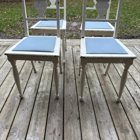 De står flotte og har kun lidt overfladeridser og brugsspor. Stolene har altid været brugt med hynder.