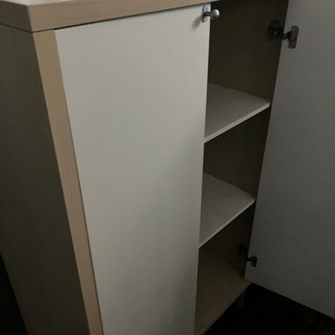 Skabet har beslag i venstre side og nøgle, så det kan låses.