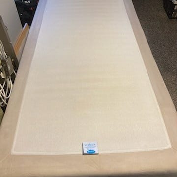 Elevationsseng ramme med tilhørende lamelbund og ben. Rammen er betrukket med mørkt stof og har en bredde og længde målt med målebånd. Lamelbunden består af trælameller monteret i rammen. Benene er cylindriske og monteret på rammen. Sengens dimensioner kan aflæses på billederne med målebånd.