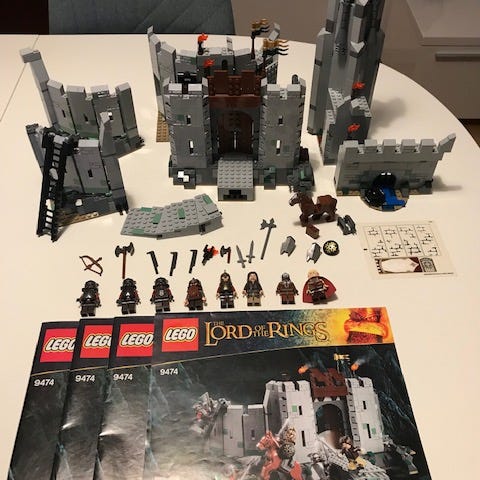Ingen minifigurer eller tilbehør. De lysegrå klodser har noget solskade