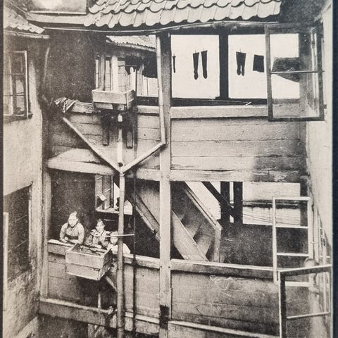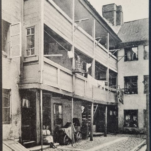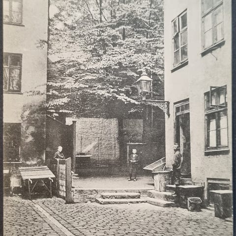 Gårdinteriør fra Pilestræde 32. Stort gammelt bindingsværkshus med tilbygning & topbygning. Gaden blev først fuldt udbygget under renæssancen, hvor Pilegården blev udstykket. Gaden huser Berlingske Tidende fra 1765.