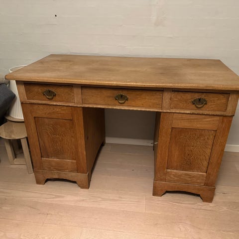 Flot og solidt 75 år gammelt egetræsskrivebord med smukke udskæringer og dybe skuffer (62 cm)