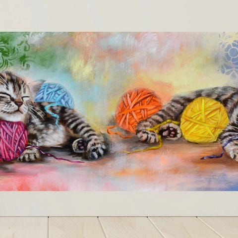 Stort Maleri med motiv af kat i jakkesæt og pink figurer