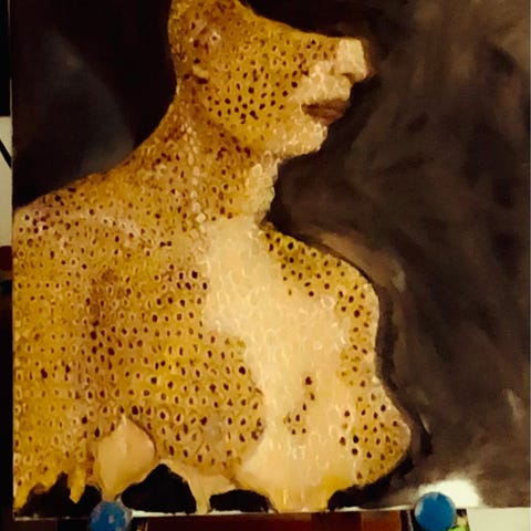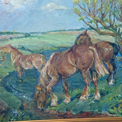 Maleri af nøgen kvinde sammen med en hest. Billedet viser en nøgen kvinde i en intim positur med en hest i baggrunden. Velegnet til dekorative formål.