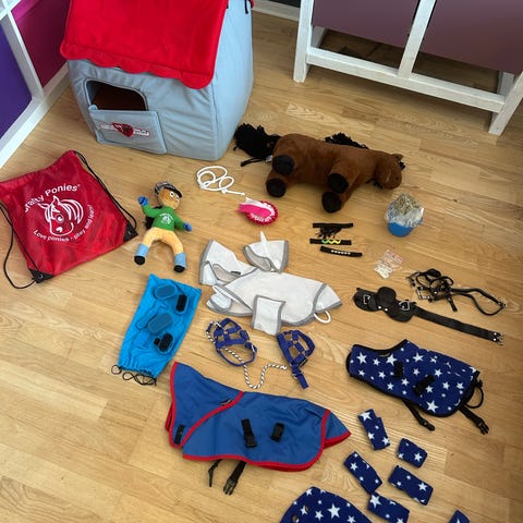 Crafty Ponies. Hest, rytter, saddel, hovedtøj, grimetræktov, spand.