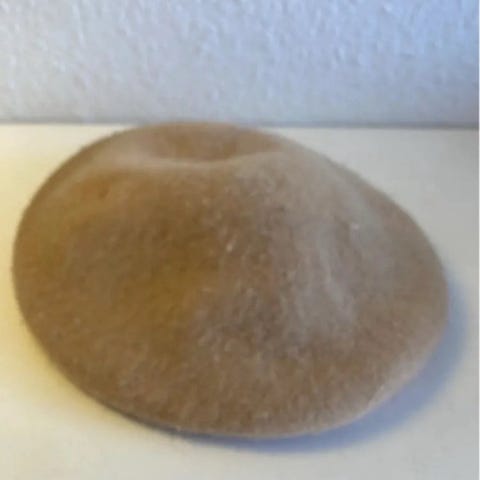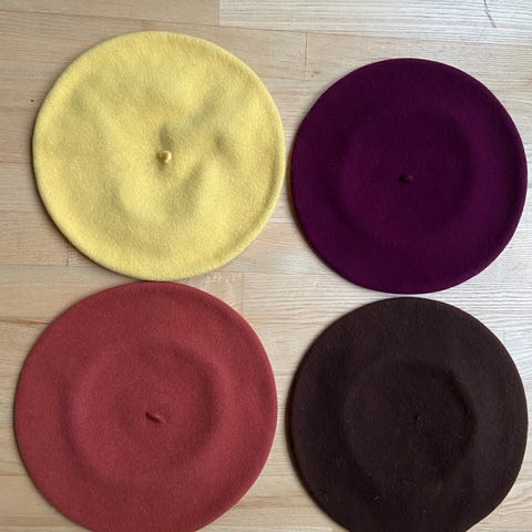 Den sorte og den lysebrune(kamelfarvet) måler Ø 25cm fra kant til kant udvendig, åbning til hoved Ø 15cm. Begge engelske og uld.