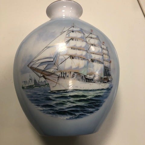 Royal Copenhagen vase med motiv af en sejlbåd på havet. Vasen er fremstillet i porcelæn og har en blå og hvid farve. Den er dekoreret med maritime elementer og bærer Royal Copenhagens mærke på undersiden. 19 cm høj.