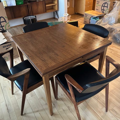 Flot vintage palisander spisebord fra 1960’erne. Fremstår i flot stand med aldersrelaterede brugsspor. Kommer med 2 forlængerplader - den ene med sarg.