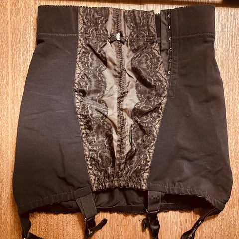 Hvid, mærke ukendt men har mærkat mærket 1300 27 28 substandard, måler 64 cm i taljen. Har fast uelastisk materiale på et smalt stykke i siderne samt foran og bagpå. Desuden dobbelt elastisk materiale på forsiden. 6 stropper til strømper på hver side.