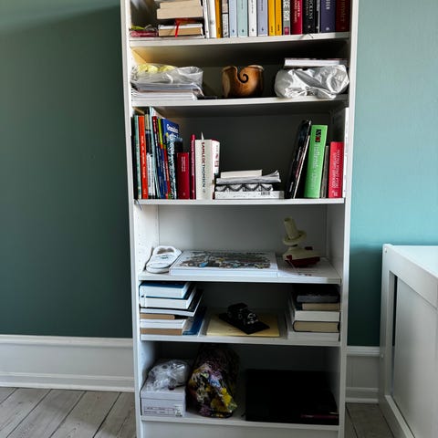 Hvid reol med indsatser, to skabe, 4 skuffer, samt rød opbevaringsboks