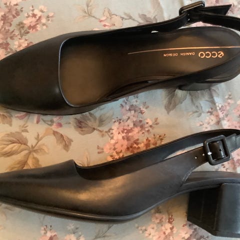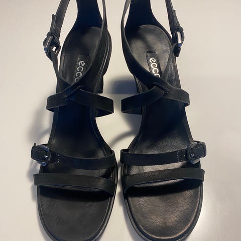 ECCO højhælet sko i størrelse 38. Skoene er sort og har en rund tåform. Materialet fremstår som læder eller lignende, og skoene har en solid hæl. Velegnet til formelle eller daglige brugssituationer.