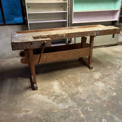 Arbejdsbord i træ med integreret skruestik. Bordet har en robust konstruktion og en stor arbejdsflade, der egner sig til forskellige håndværksopgaver. Skruestikken er monteret i bordets kant for fastspænding af materialer under arbejde.