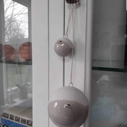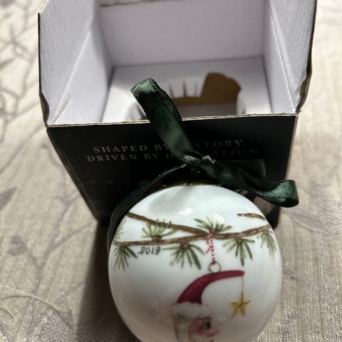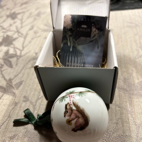 Kähler Juleophæng kugle til jul med dekoration af naturmotiver i farverne rød, grøn og brun på hvid baggrund. Kuglen er lavet af keramik og er beregnet til juleudsmykning. Meget lidt brugt - i original æske - kan sendes for 47 kr
