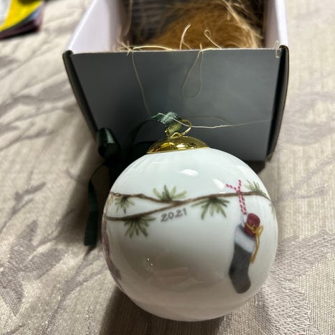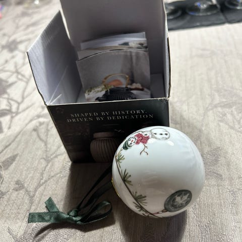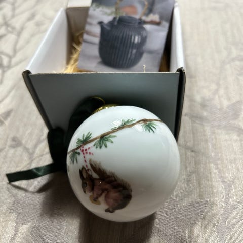 Kähler Hammershøi Juleornament kugle i porcelæn med julemotiv og grønne grene. Dekorationsgenstand til brug i juletiden. Årstal 2022 - Meget lidt brugt - i original æske- kan sendes for 47 kr