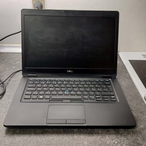 Dell bærbar computer med standard tastatur og touchpad. Computeren er sort og har en tilhørende oplader.